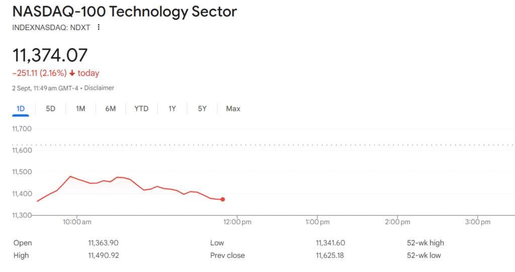 The S&P 500 index (Standard & Poor’s 500) measures 500 large-cap U.S. stocks across all sectors. It’s broader than the Dow and is often used as a market proxy. On Tuesday, the S&P 500 fell about 54 points to ~6,406 (about –0.84%) by 10:04 am ET. By day’s close, it was down just over 1%. That follows August’s gains: the S&P had climbed ~1.9% in August, bringing its year-to-date gain to roughly 10%.